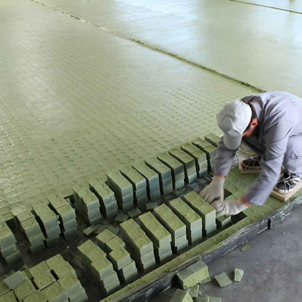 After the saponification process is complete—when the oils have been fully transformed into soap—each individual bar is carefully lifted and cleaned by hand. This important step removes any excess oil or residue from the soap’s surface, ensuring a smoother and more refined final product. Once cleaned, the bars are placed in special subterranean cellars where they are stored away from sunlight. These cool, ventilated cellars provide the ideal environment for the soap to continue its curing process, further enhancing its quality and durability.